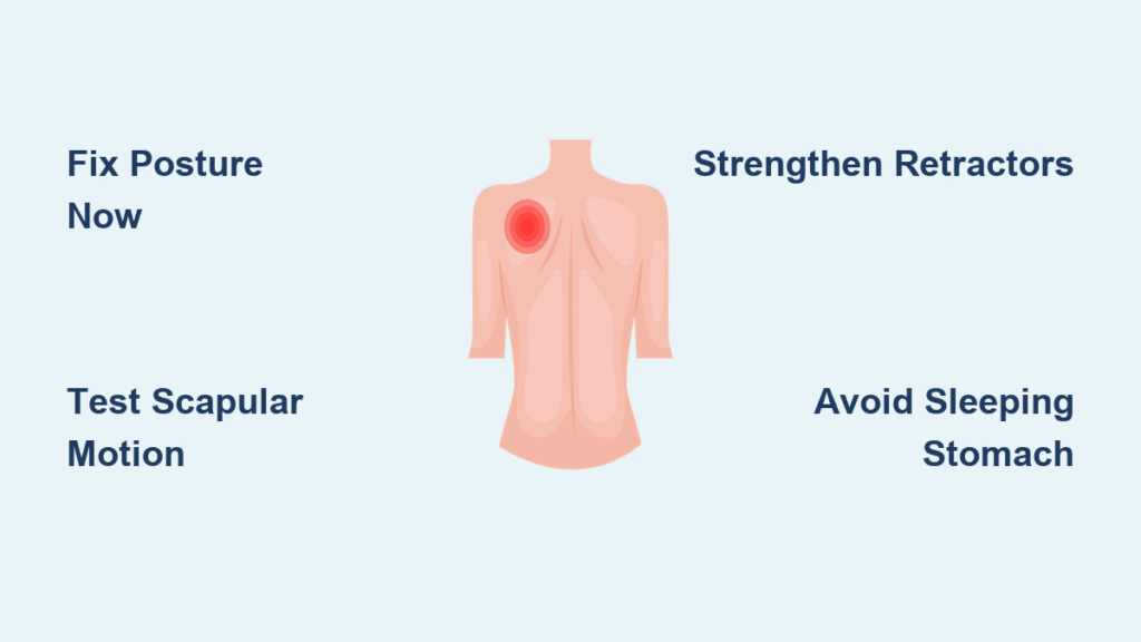 Prolonged sitting creates a devastating cycle: your chest muscles (pectoralis major/minor) tighten from keyboard hunching, while critical stabilizers like your rhomboids, middle trapezius, and serratus anterior weaken from disuse. This imbalance pulls your shoulder blade forward and downward, straining its connection to the spine. The result? Up to 20 degrees of abnormal scapular positioning that multiplies stress on supporting muscles during everyday tasks like lifting a coffee cup or turning to check traffic. You feel this as deep, localized pain under your shoulder blade – your body’s alarm system for mechanical dysfunction.
