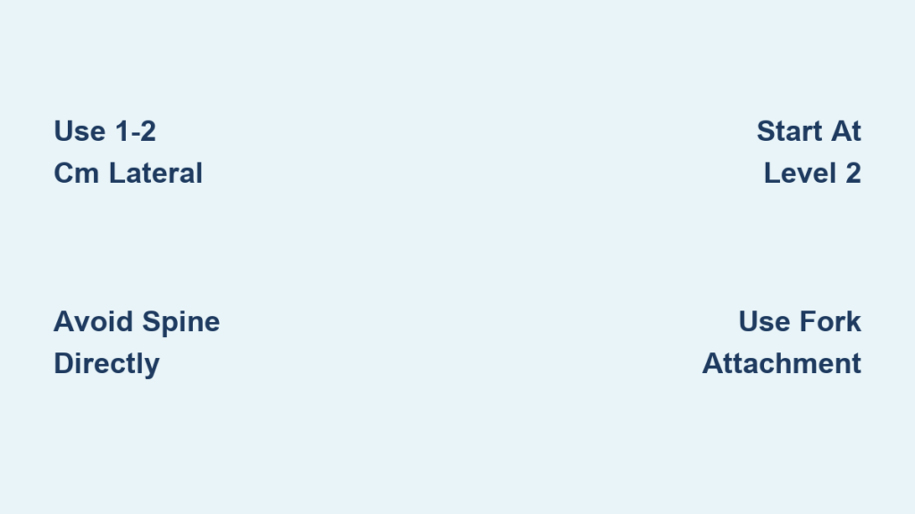 Attach the Fork head. Position it to straddle your spine, staying 1-2 cm lateral. Glide upward from your sacrum to mid-back at Level 3. Move slower than you think—true tissue release happens at turtle pace. Pause 2 seconds on any “ropey” knots detected during your body scan.
