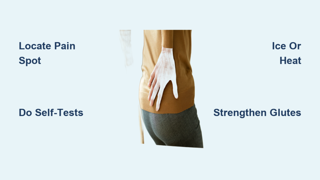 Ice vs Heat Decision Tree: Use ice packs (15 minutes every 2-3 hours) for the first 48 hours if pain feels sharp and “hot.” Switch to heat (20 minutes) after 48 hours for dull, achy muscle tension. Positioning for relief: For SI joint pain, sleep on your non-painful side with a pillow between knees. If disc involvement is suspected, lie on your back with knees elevated on a chair. Hip joint pain sufferers should recline with the painful leg externally rotated—place a rolled towel under the knee for support. Avoid sitting longer than 20 minutes during this phase.